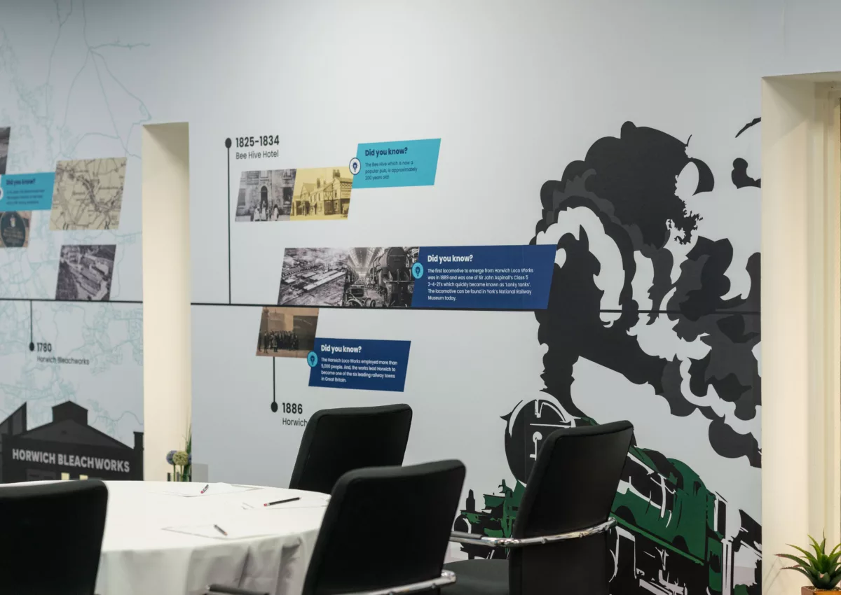 Now the arena’s marketing and signage partner, Cornerstone Design and Marketing based in Oldham, has designed and created the 78ft wide mural that will be fitted to one wall that divides into three parts in the conference suite.